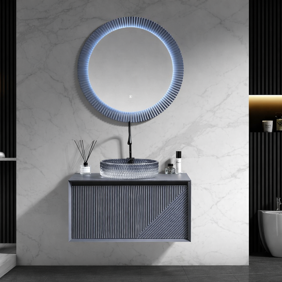 15mm PVC board 0.5 density Main Cabinet: 800*480*510 Crystal glass basin w/o faucet(if change to common white round ceramic basin,price is 26$ cheaper) Stone countertop Led Mirror: 750*750 with touch switch Soft close drawer