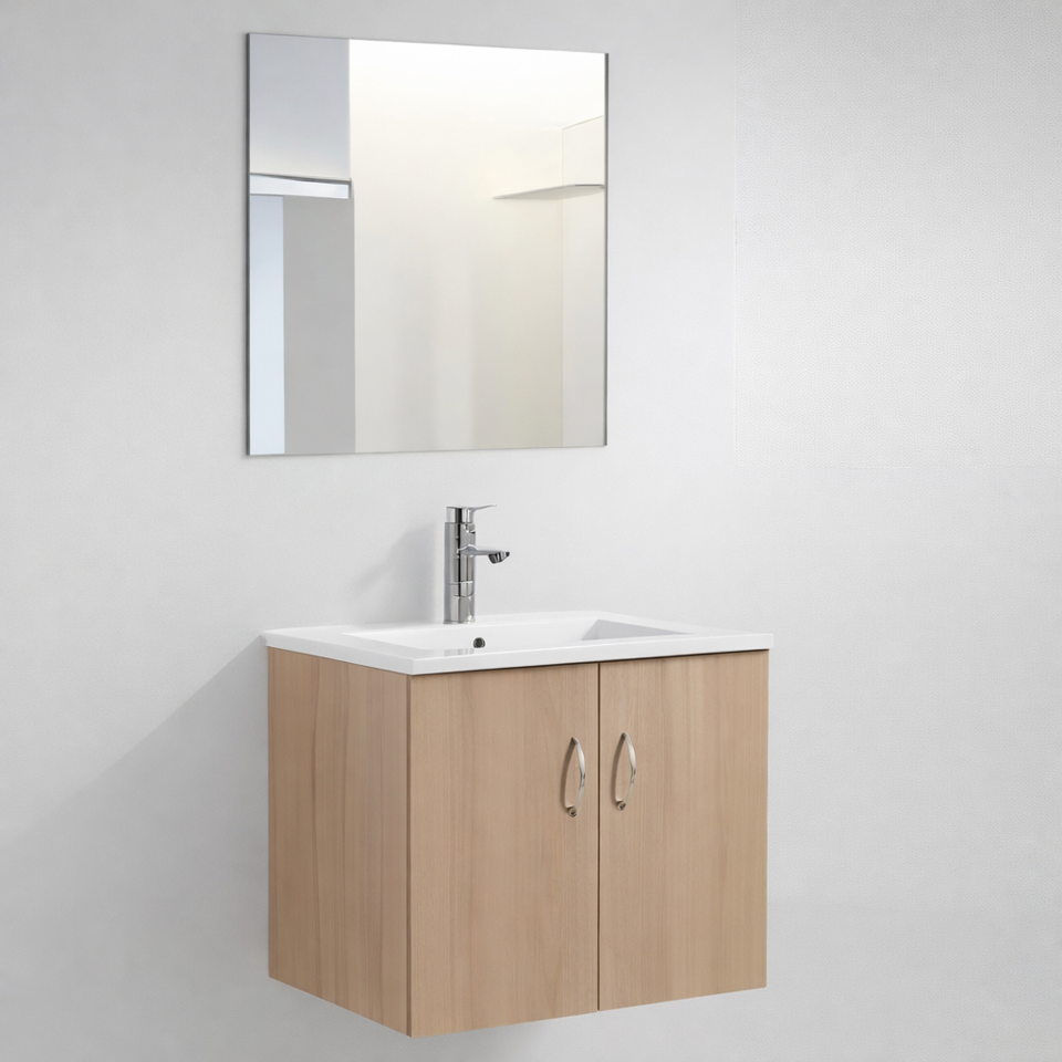 1. 15mm PVC Carcass + Pvc film surface 2. Ceramic basin 3. Mirror with frame 4. Soft close doors Main cabinet:60*46*48 Mirror: 50*70